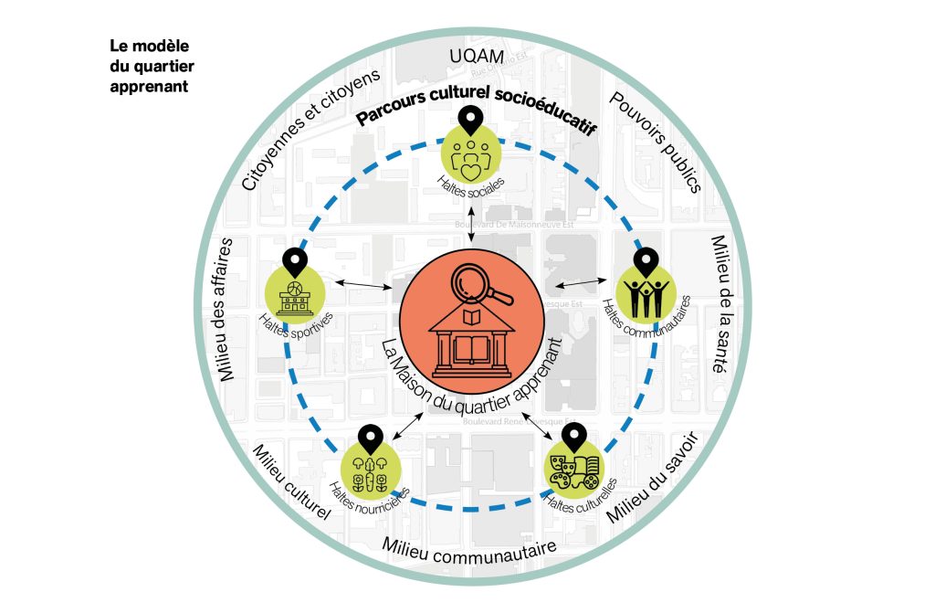 Il s’agit d’un quartier aménagé à l’échelle humaine où l’on apprend en français tout au long de la vie et où l’on favorise le maillage entre les connaissances scientifiques, la culture et les savoirs citoyens afin de répondre à des enjeux du Quartier latin et de la société québécoise. Le modèle de quartier apprenant s’appuie sur les principes des villes apprenantes qui s’inscrivent pleinement dans les valeurs de l’UQAM : accessibilité, engagement, audace et ouverture.